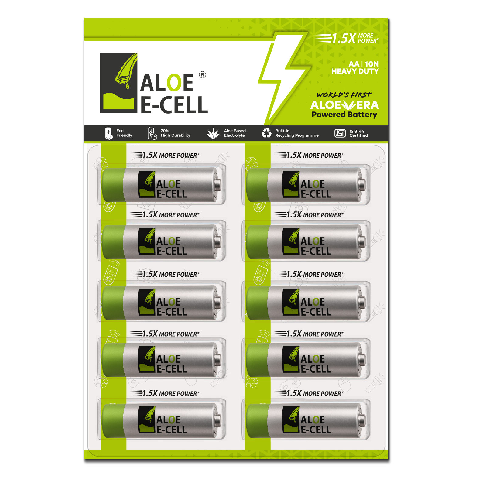 World's first 100% eco-friendly AA battery, aloe vera herbal electrolyte, 1.5V nominal voltage, 1.5x longer performance than zinc carbon, NABL certified (IS 8144:2018), built-in recycling program, non-explosive design, leak-resistant construction, temperature stable operation